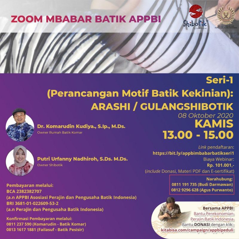 Asosiasi Perajin dan Pengusaha Batik Indonesia (APPBI), bekerjasama dengan Shibotik by Batik Komar, Zoom Mbabar Batik APPBI Seri-1 (Perancangan Motif Batik Kekinian): ARASHI / GULANGSHIBOTIK, Kamis, 08 Oktober 2020, Pukul 13.00 – 15.00 WIB, Dr. Komarudin Kudiya., S.Ip., M.Ds., Ketua Umum APPBI, Pemilik Batik Komar-Bandung; Putri Urfanny Nadhiroh, S.Ds. M.A., Pemilik Shibotik Diikuti oleh 37