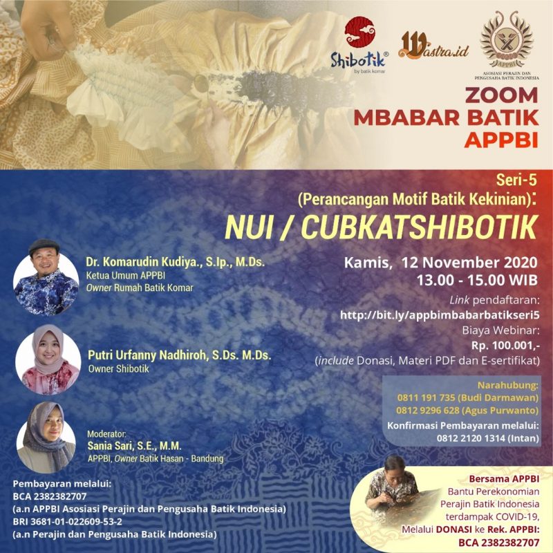 Asosiasi Perajin dan Pengusaha Batik Indonesia (APPBI), bekerjasama dengan Shibotik by Batik Komar, Zoom Mbabar Batik APPBI Seri – 5: (Perancangan Motif Batik Kekinian) NUI/CUBKATSHIBOTIK, Kamis, 12 November 2020, Pukul 13.00 – 15.00 WIB, Dr. Komarudin Kudiya., S.Ip., M.Ds., Ketua Umum APPBI, Pemilik Batik Komar-Bandung; Putri Urfanny Nadhiroh, S.Ds. M.A., Pemilik Shibotik; Moderator: Sania Sari,