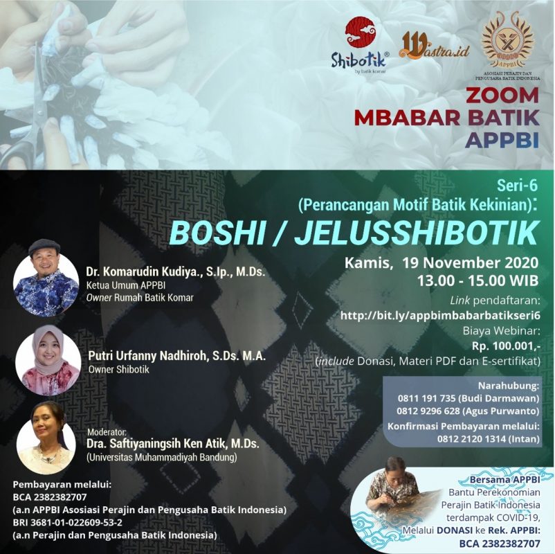 Asosiasi Perajin dan Pengusaha Batik Indonesia (APPBI), bekerjasama dengan Shibotik by Batik Komar, Zoom Mbabar Batik APPBI Seri – 6: (Perancangan Motif Batik Kekinian): BOSHI / JELUSSHIBOTIK, Kamis, 19 November 2020, Pukul 13.00 – 15.00 WIB, Dr. Komarudin Kudiya., S.Ip., M.Ds., Ketua Umum APPBI, Pemilik Batik Komar-Bandung; Putri Urfanny Nadhiroh, S.Ds. M.A., Pemilik Shibotik; Moderator: