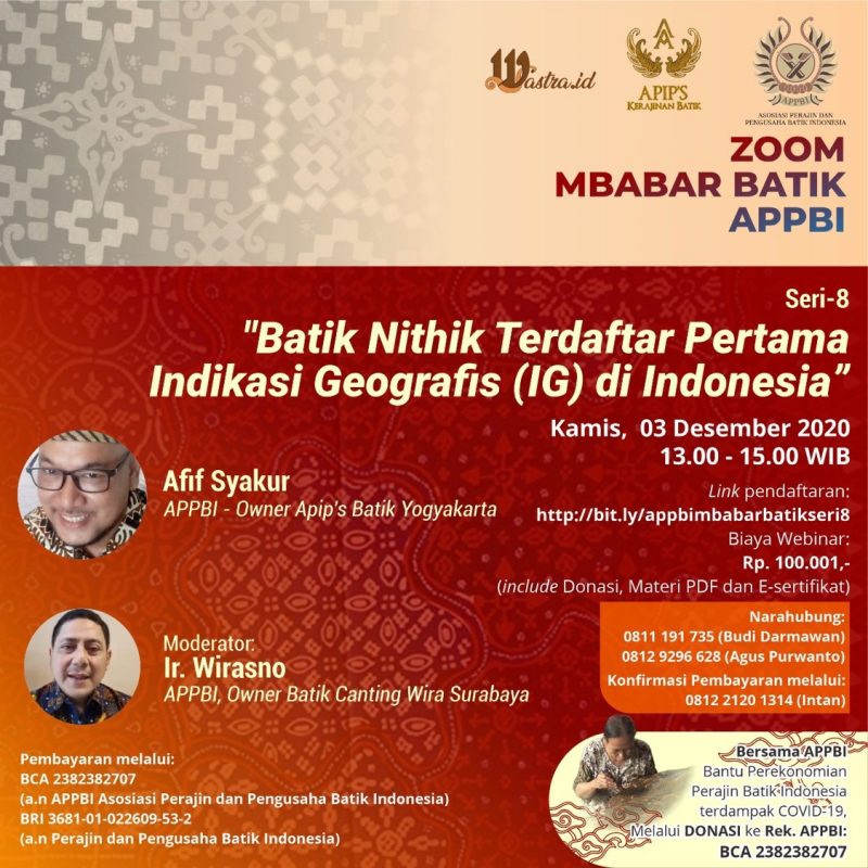 Asosiasi Perajin dan Pengusaha Batik Indonesia (APPBI) bekerjasama dengan Apip’s Batik Yogyakarta, Zoom Mbabar Batik APPBI Seri – 8: “Batik Nithik Terdaftar Pertama Indikasi Geografis (IG) di Indonesia”, Kamis, 3 Desember 2020, Pukul 13.00 – 15.00 WIB, Nara sumber : Afif Syakur (APPBI – Apip’s Batik Yogyakarta), Moderator : Ir. Wirasno (APPBI, Batik Canting Wira
