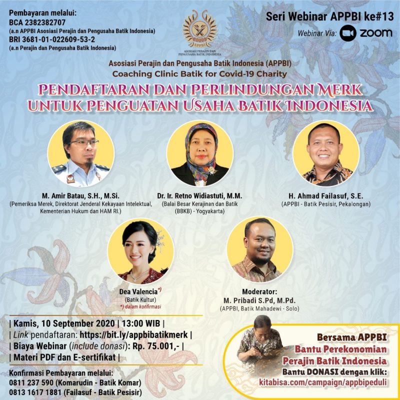 “Pendaftaran dan Perlindungan Merek untuk Penguatan Usaha Batik Indonesia”, Kamis, 10 September 2020 Pukul 13.00 WIB, Narasumber: M. Amir Batau, S.H., M.H., M.Si. (Pemeriksa Merek, Direktorat Jenderal Kekayaan Intelektual, Kementerian Hukum dan HAM RI.); Dr. Ir. Retno Widiastuti, M.M. (Balai Besar Kerajinan dan Batik (BBKB) – Yogyakarta); H. Ahmad Failasuf, S.E. (APPBI – Batik Pesisir,