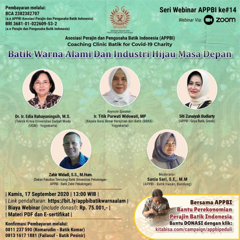 “Batik Warna Alami dan Industri Hijau Masa Depan”, Kamis, 17 September 2020 Pukul 13.00 WIB, Keynote Speaker: Ir. Titik Purwati Widowati, MP (Kepala Balai Besar Kerajinan dan Batik (BBKB) – Yogyakarta); Narasumber: Dr. Ir. Edia Rahayuningsih, M.S. (Teknik Kimia Universitas Gadjah Mada (UGM) – Yogyakarta); Zahir Widadi, S.S., M.Hum. (Dekan Fakultas Teknologi Batik Universitas Pekalongan