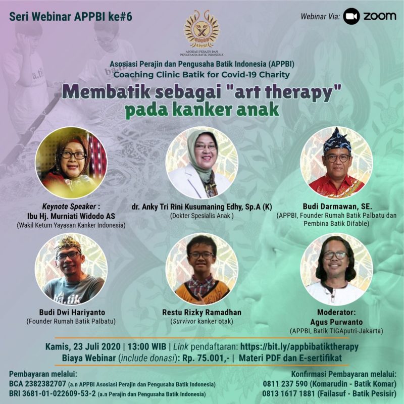 Membatik Sebagai “Art Therapy” Pada Kanker Anak, Kamis, 23 Juli 2020 Pukul 13.00 WIB, Keynote Speaker: Ibu Hj. Murniati Widodo AS, Ketua Dewan Pengawas Yayasan Batik Indonesia dan Wakil Ketum Yayasan Kanker Indonesia; Narasumber: dr. Anky Tri Rini Kusumaning Edhy, Sp.A (K), (Dokter Spesialis Anak); Budi Darmawan, SE. (APPBI, Founder Rumah Batik Palbatu dan Pembina